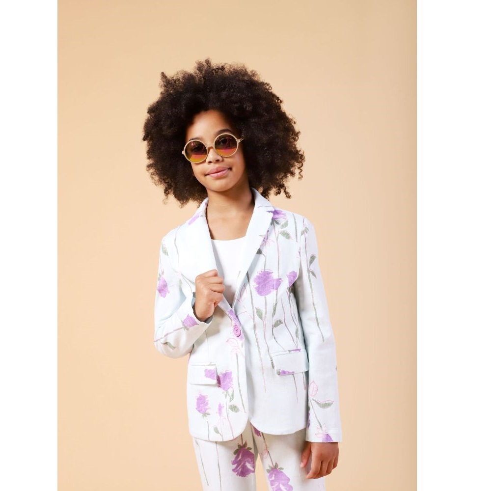 giacca in denim con stampa fiori, finte tasche con patte su fondo