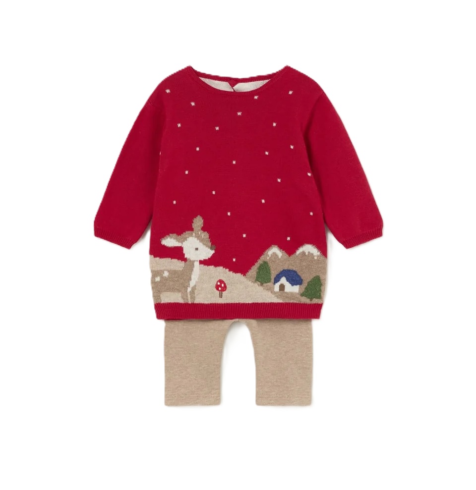 Completo 2 pezzi composto da leggings tinta unita e maglioncino con pois e animali a contrasto