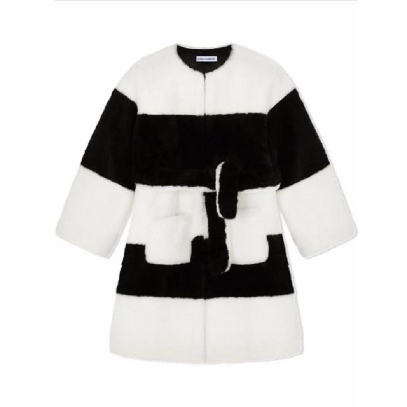 cappotto lungo in ecopelliccia a fasce alternate con tasche e fusciacca in vita