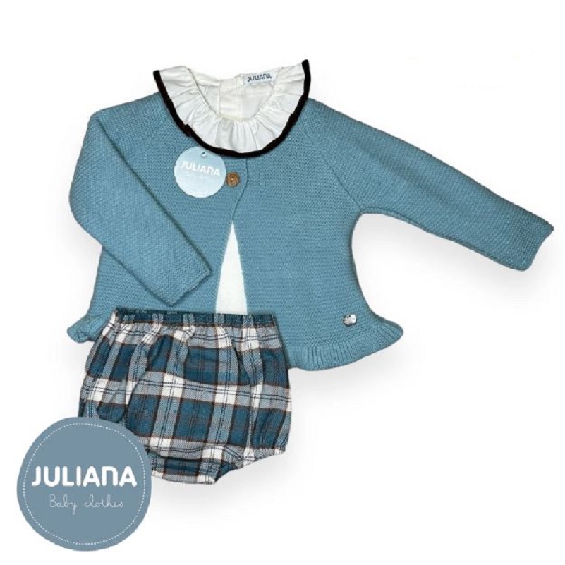 completo composto da cardigan in maglia tinta unita con chiusura bottoncini, blusa con colletto volant e coulotte a quadri