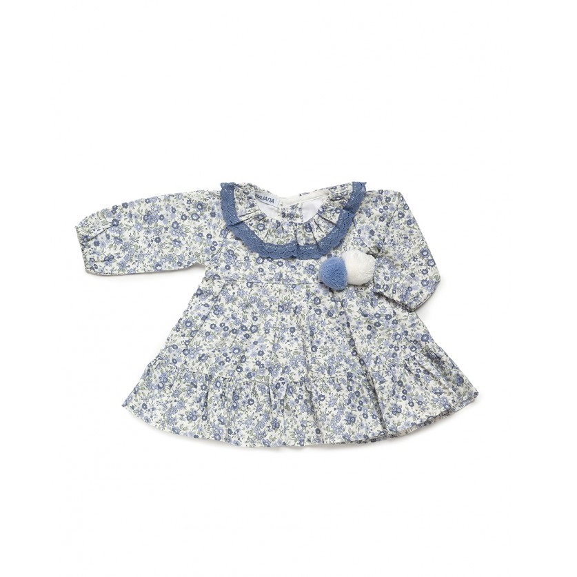 vestito svasato a fantasia floreale con maxi colletto volant dal profilo in pizzo, dettaglio applicazione pom pom in vita