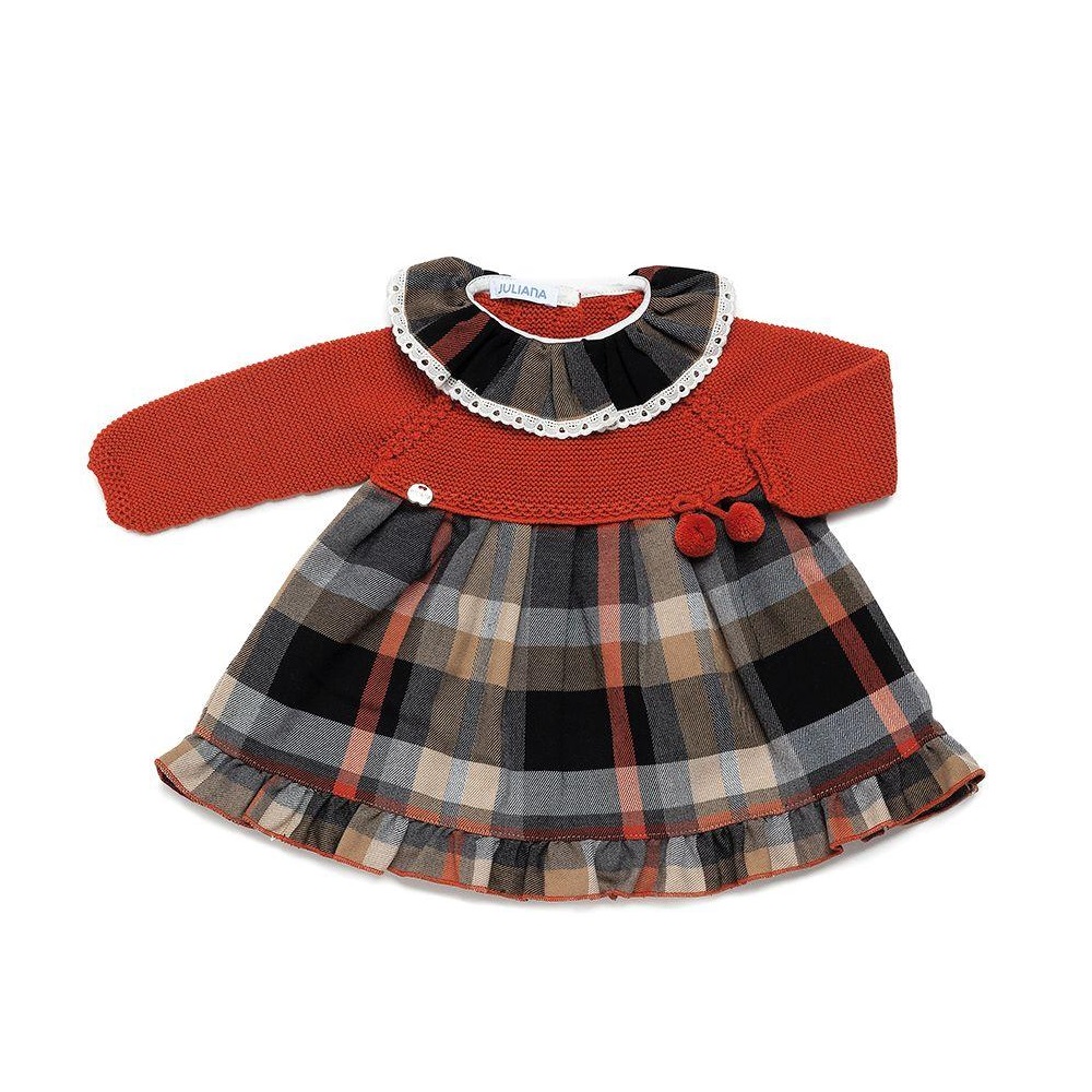 vestito composto dalla parte superiore in tricot tinta unita con colletto volant e parte inferiore a quadri
