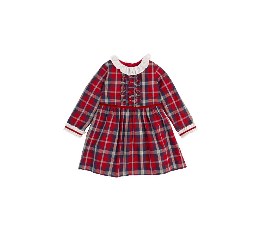 Abito tartan a manica lunga con rounges anteriore, colletto e profili maniche a contrasto con calze in coordinato