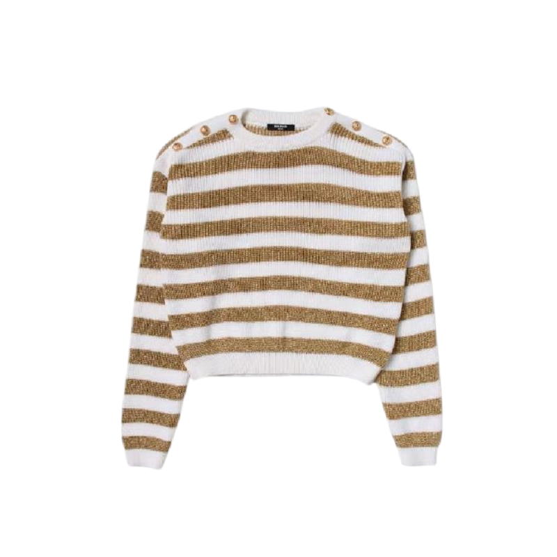 pullover a fantasia rigata laminata dalla lavorazione a coste e dettaglio bottoni oro lungo le spalline