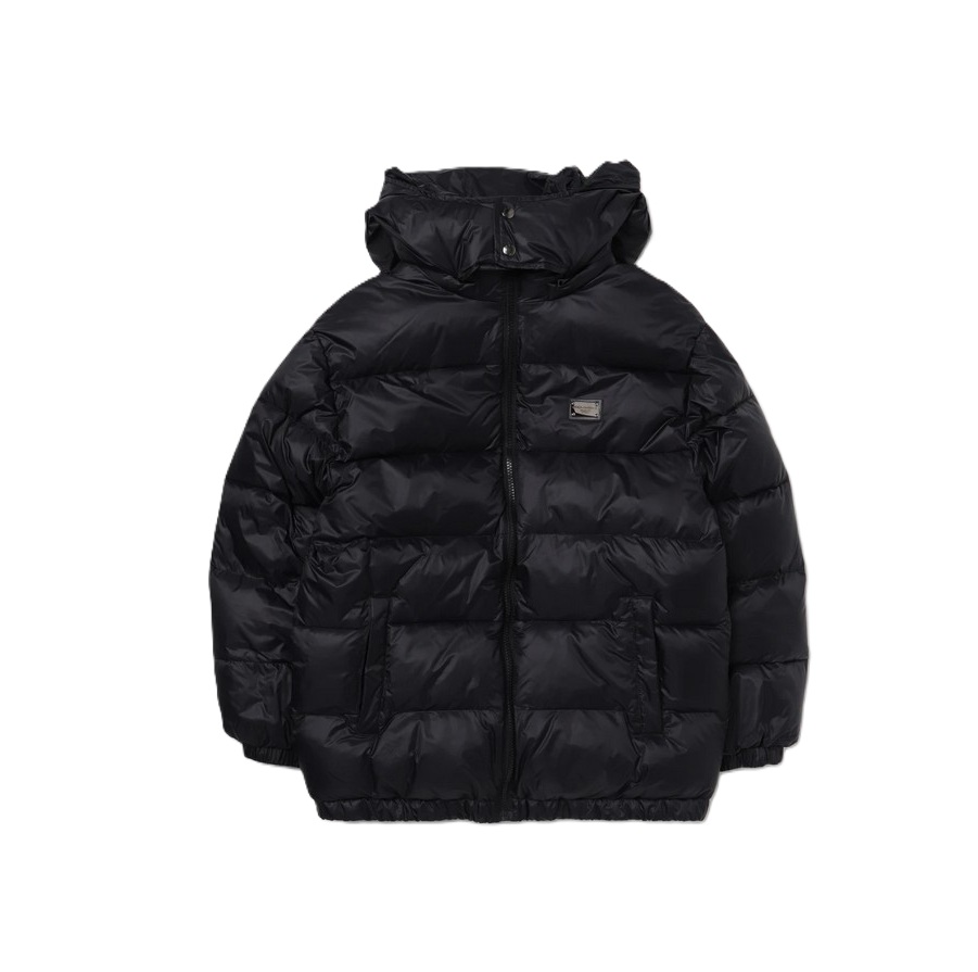 Piumino tinta unita con cappuccio removibile e collo alto. Placca metallica con logo, tasche con bottoni a pressione, fondo con coulisse elastica interna regolabile. Imbottito in piuma. Chiusura frontale con zip e cursore logato