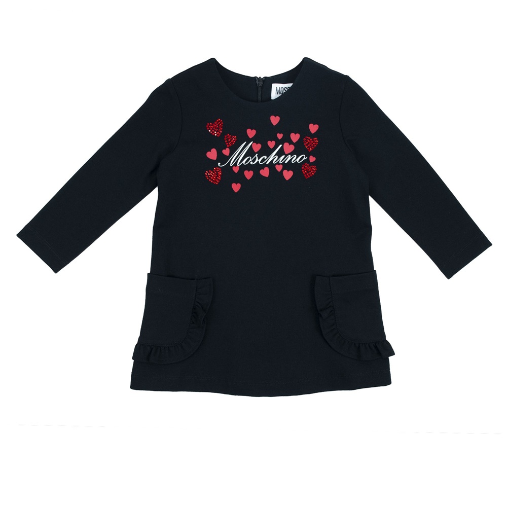 Abito tinta unita a manica lunga con stampa logo e cuore con dettaglio strass, tasche con volant sul fondo, chiusura posteriore con zip
