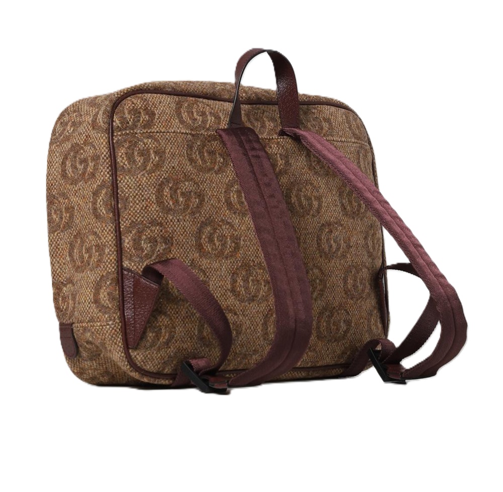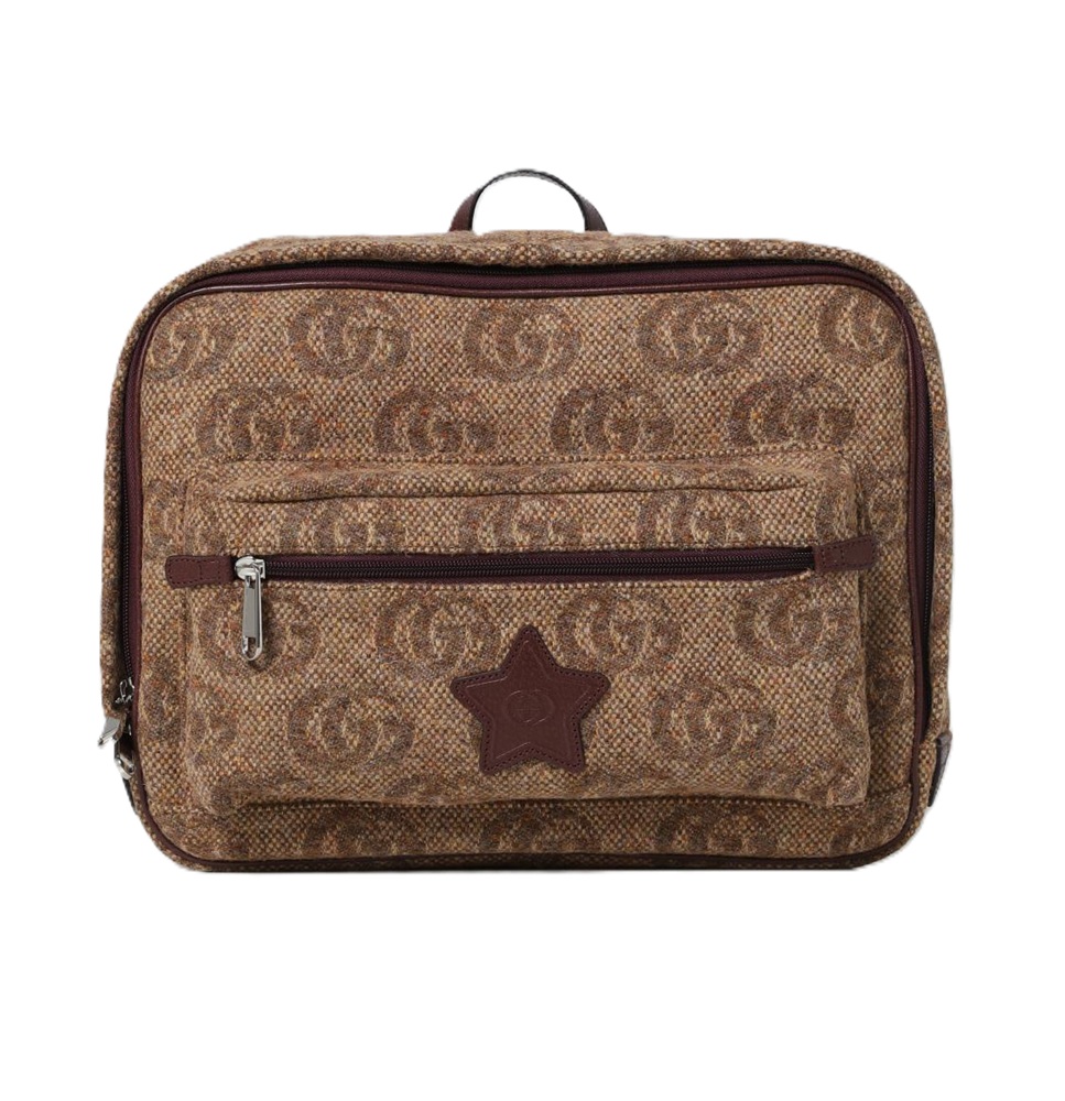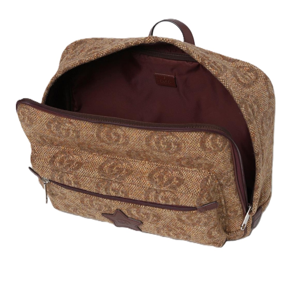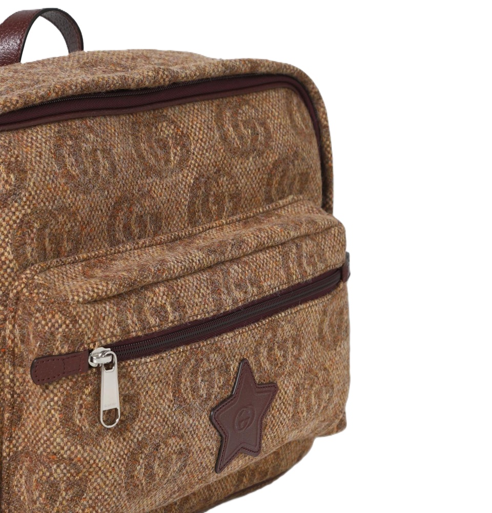 Zaino in lana con stampa logo all over e dettaglio patch stella. Chiusura superiore con zip, due spallacci regolabili e manico superiore singolo. Scomparto principale e scomparto frontale con zip.