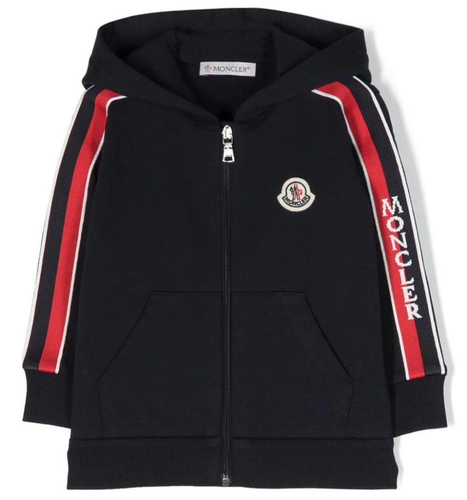Felpa con cappuccio con zip e toppa con logo sul davanti. Dettaglio a righe laterali e cappuccio. Chiusura frontale con zip e tasche frontali a marsupio,polsini e fondo a costine.