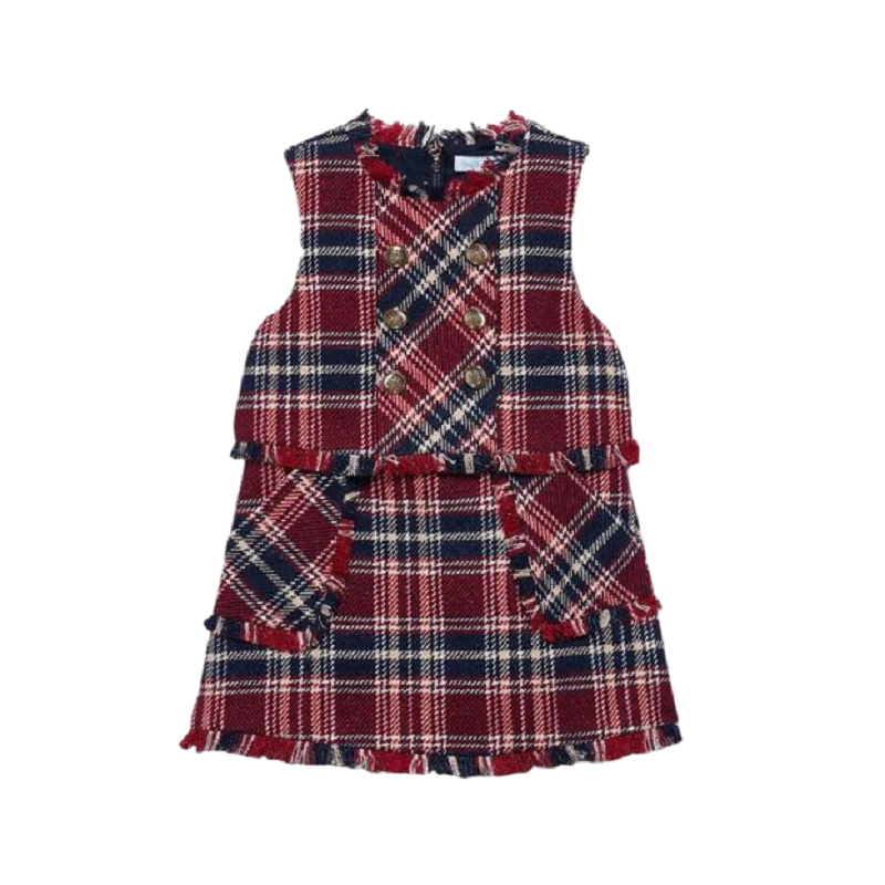 vestito a quadri in tweed ,smanicato con profili sfrangiati, bottoni oro sul davanti e tasche su fondo