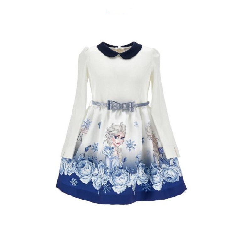 vestito a campana composto dalla parte superiore in tinta unita con colletto, cinta glitter con fiocco e parte inferiore con stampa frozen