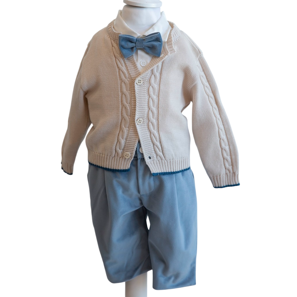 completo composto da cardigan con lavorazione intrecci,camicia regular fit bianca, papillon di velluto in richiamo del pantalone con elastico in vita