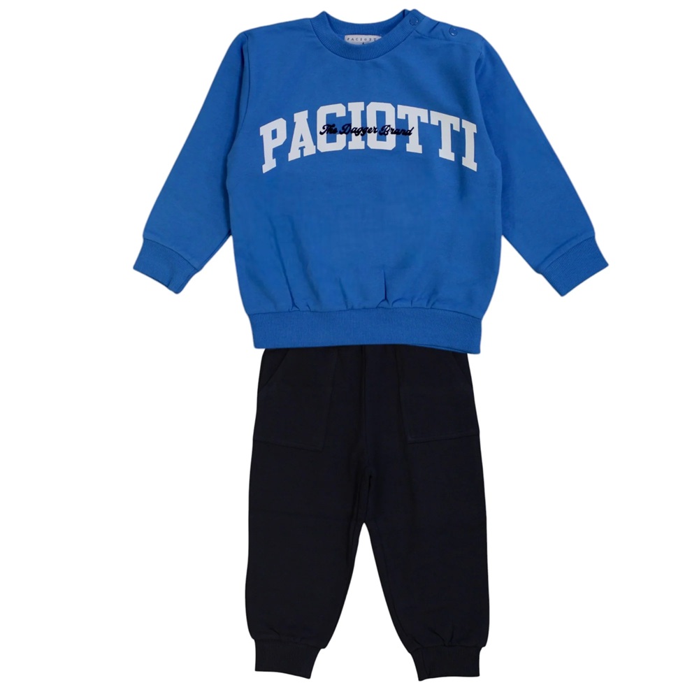 Completo composto da pantalone con elastico in vita, polsino a coste alla caviglia e felpa girocollo con compa, clips chiusura di spalla, logo stampato in contrasto.