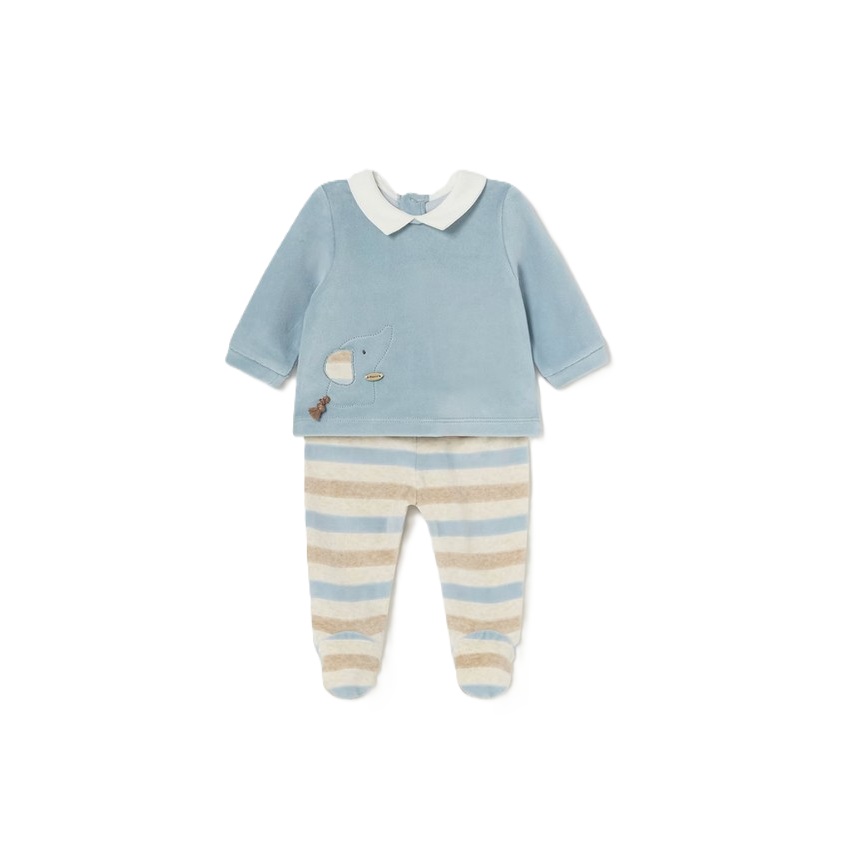 Completo in ciniglia composto da: maglia con ricamo elefante e colletto a contrasto e ghettina a righe