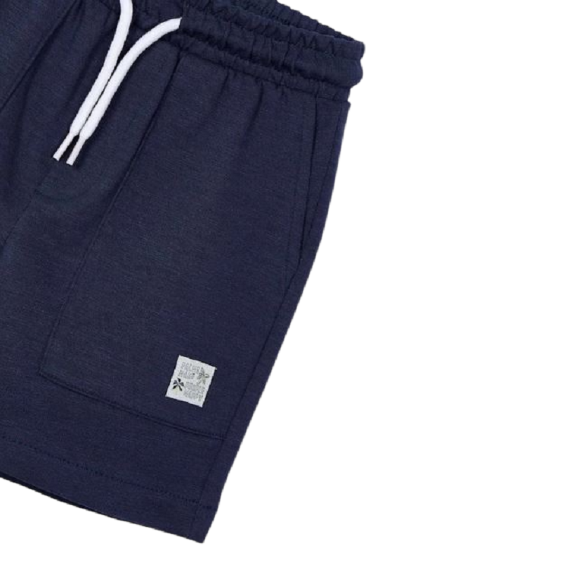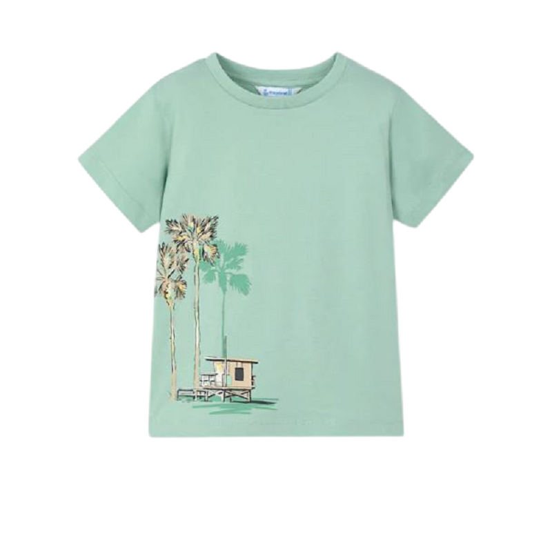 completo composto da t-shirt a mezza manica con stampa palme, canotta a fantasia palme e pantaloncino a contrasto colore in tinta unita