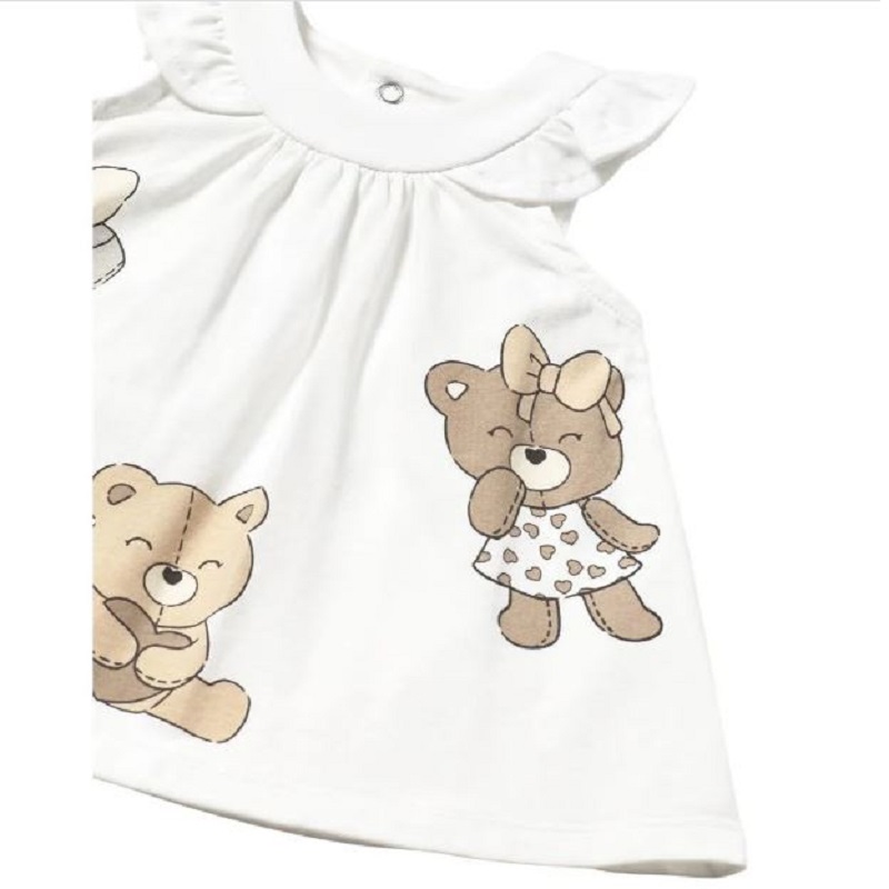 vestito svasato e smanicato in tinta unita con stampa orsacchiotti a contrasto colore su fondo, volant lungo lo scollo