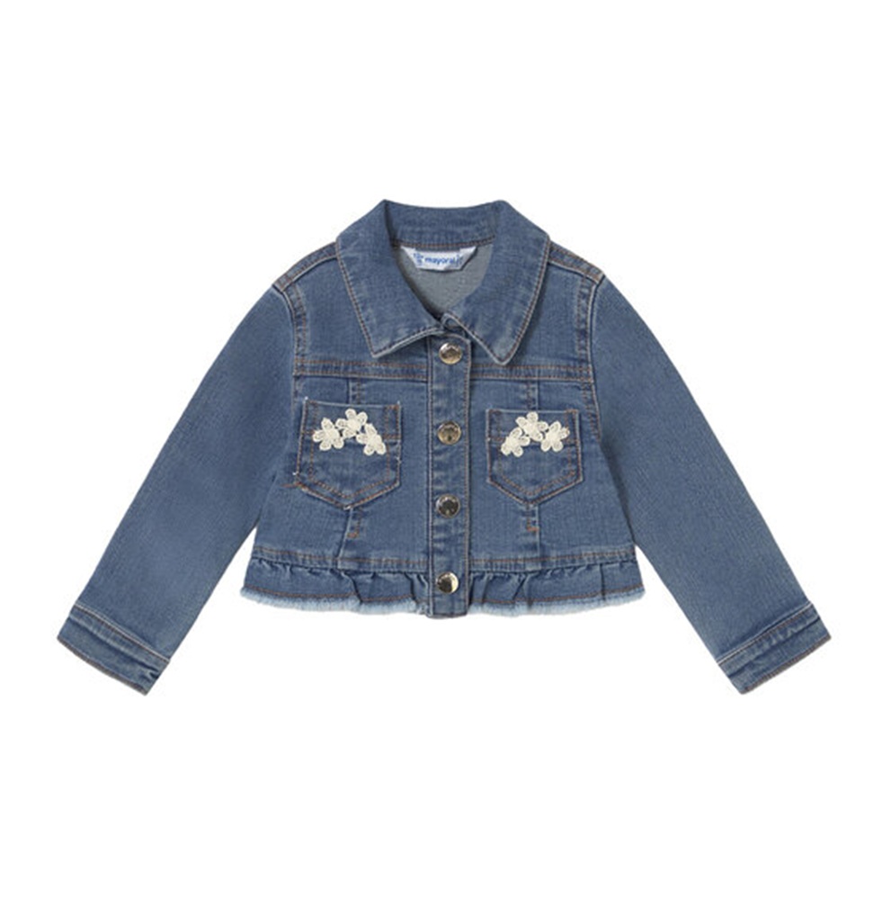 Giubbino in jeans modello crop con chiusura bottoni clips, taschini sul davanti e volant su fondo