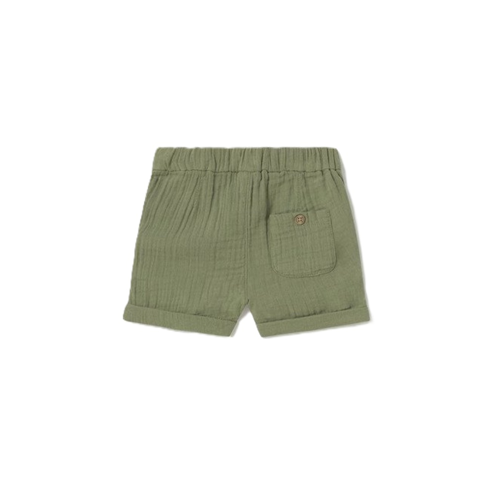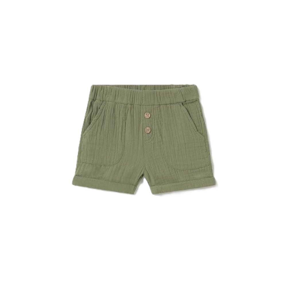 bermuda in cotone mussola tinta unita con coulisse interna in vita, tasche anteriori, risvolto su fondo e bottoncini legno