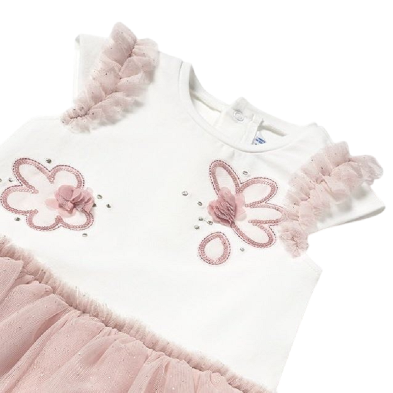 vestito svasato con rouches lungo le mezze manche, fiori applicati sul davanti e balza in tulle glitter su fondo