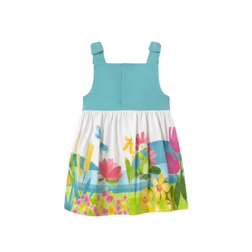 vestito svasato composto dalla parte superiore in tinta unita con fiocchi su spalline e stampa multicolore laghetto su fondo