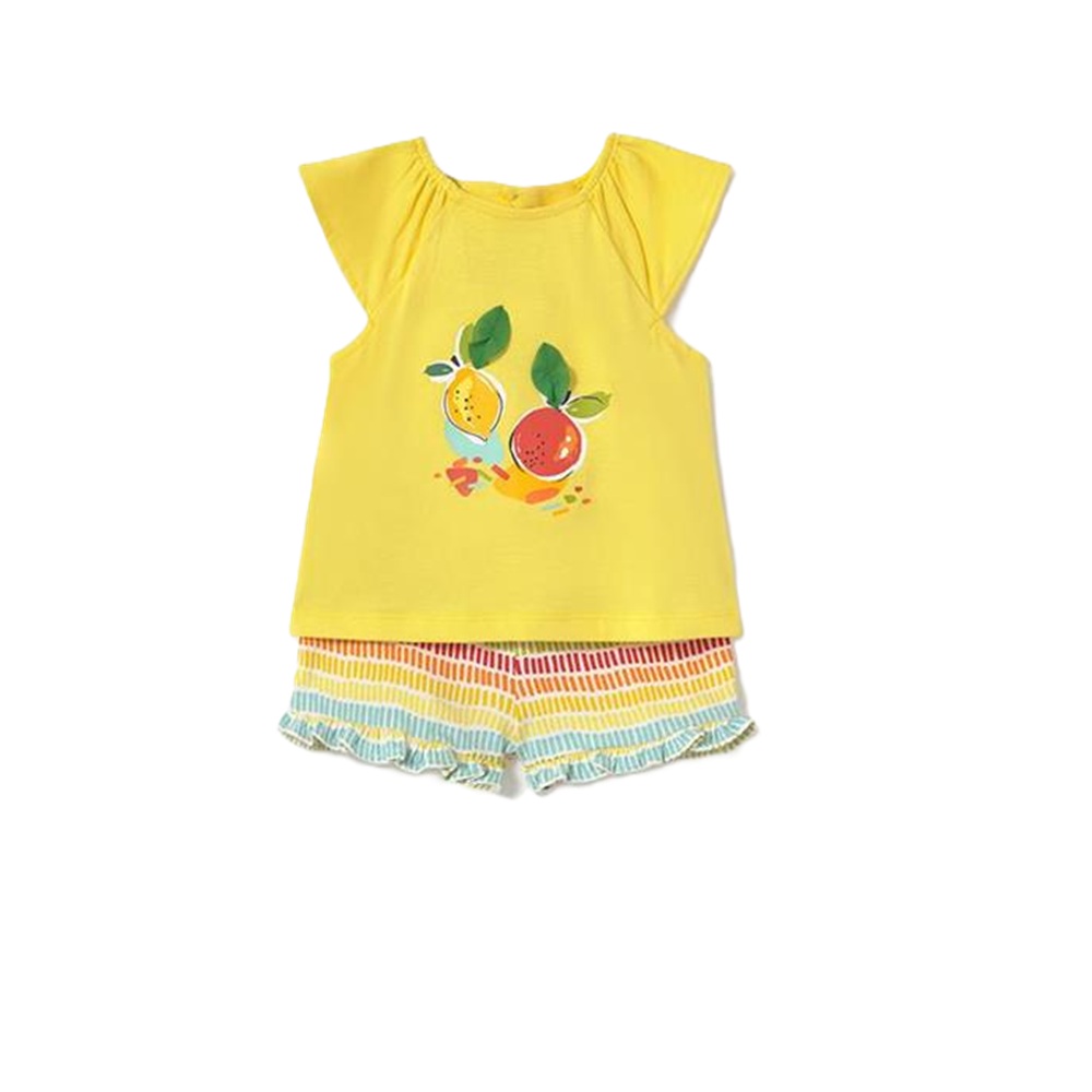 Completo 2 pezzi composto da: t-shirt manica corta con stampa frutti e pantaloncino tinta unita