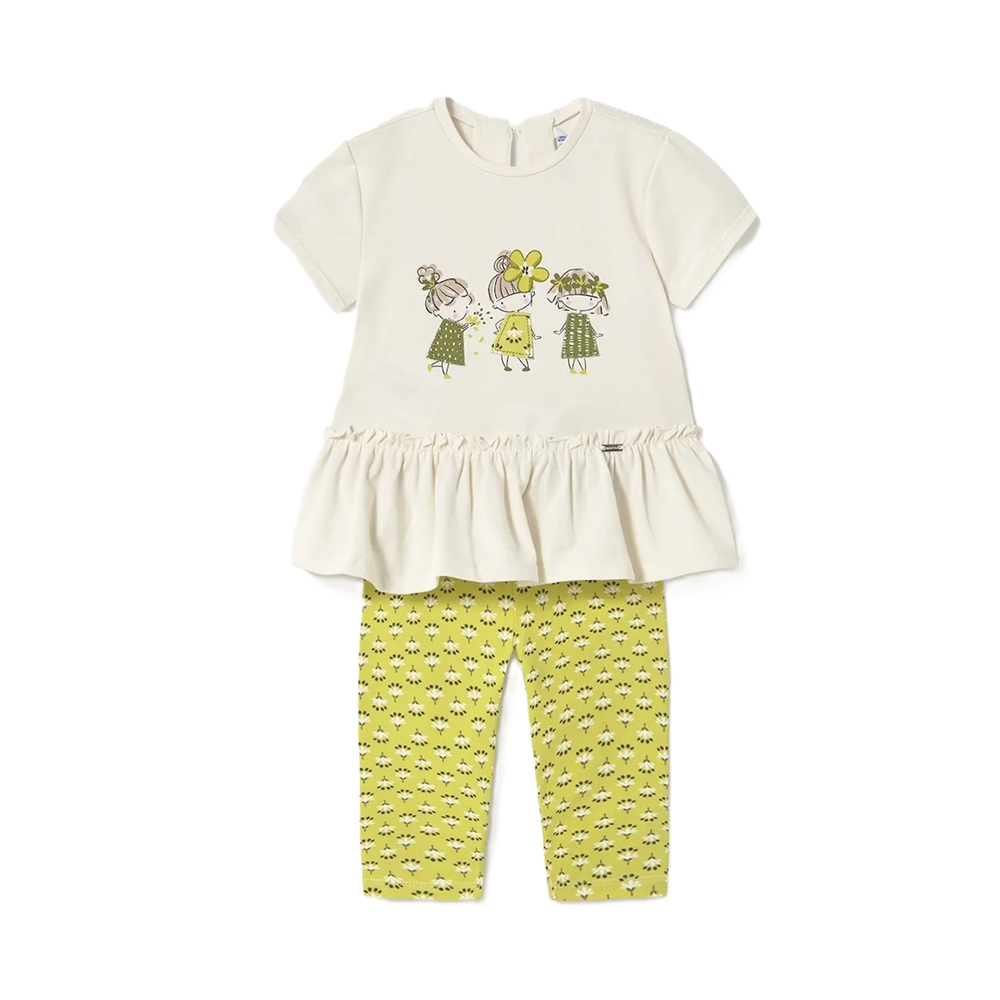 Completo 2 pezzi composto da: t-shirt manica corta con stampa bimbe e leggings a fiori in coordinato