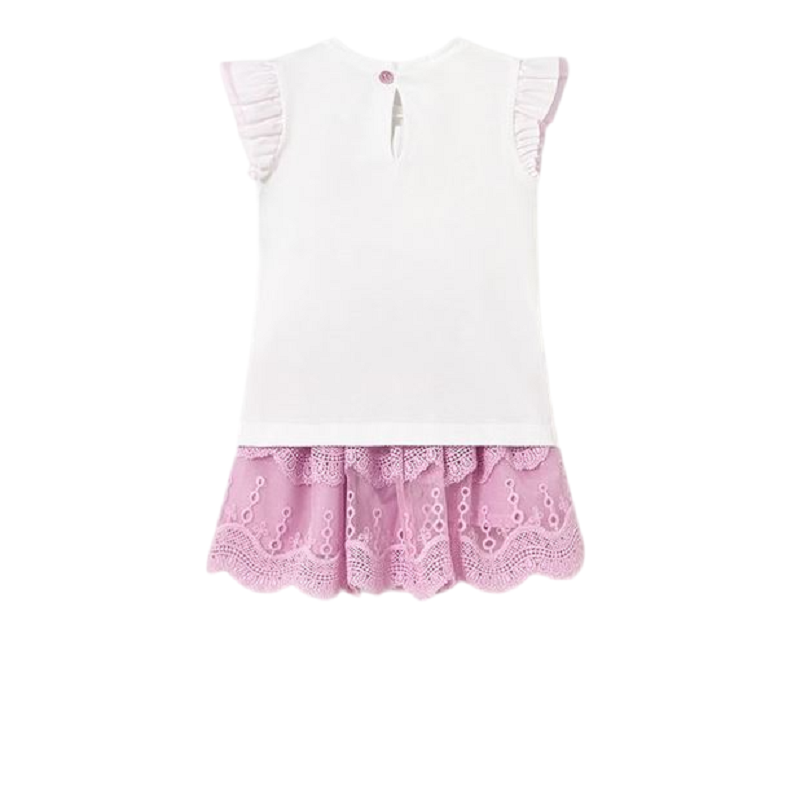 completo composto da canotta con volant su giromanica e farfalle di tulle sul davanti, gonna a balze di pizzo abbinata