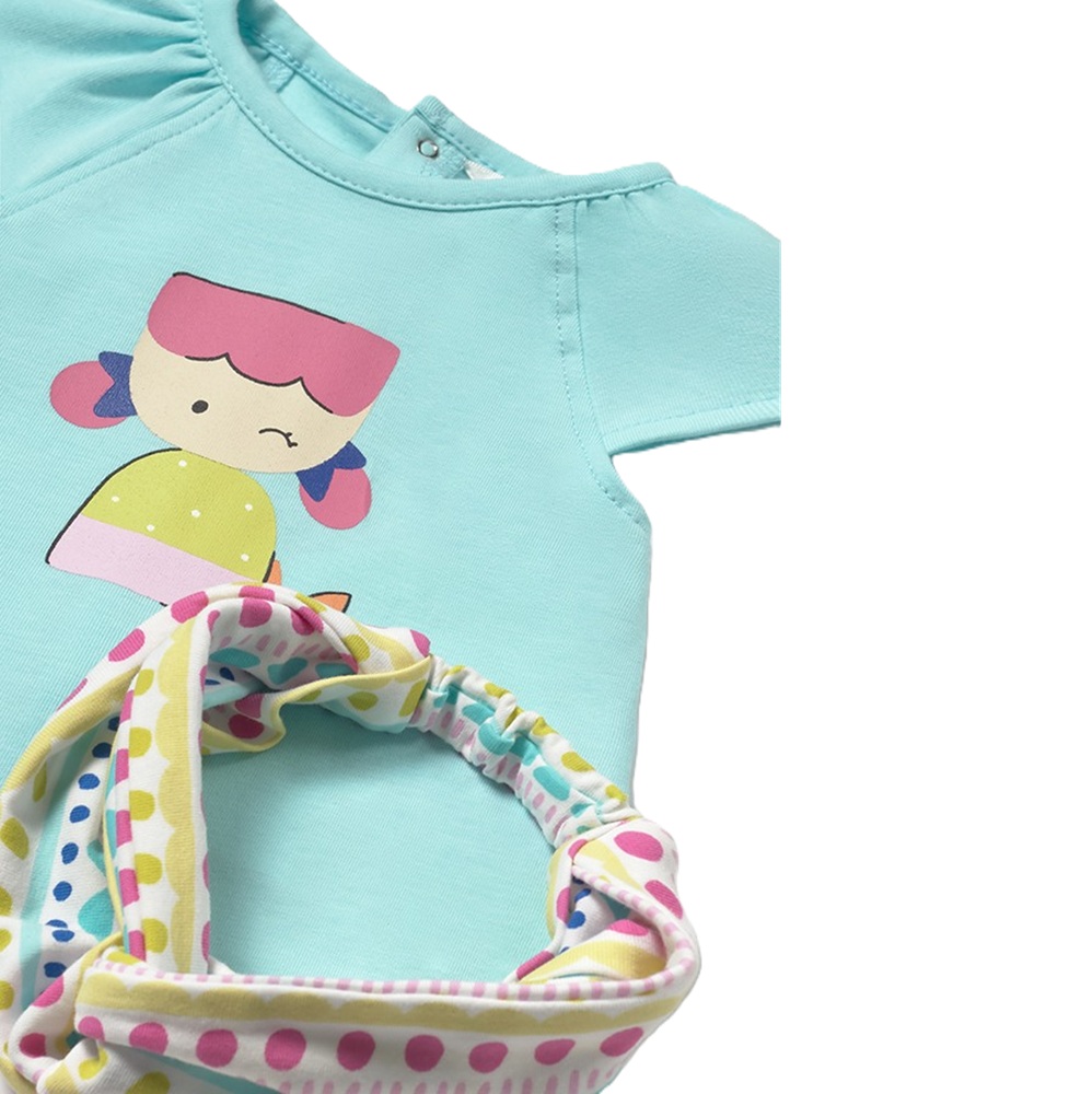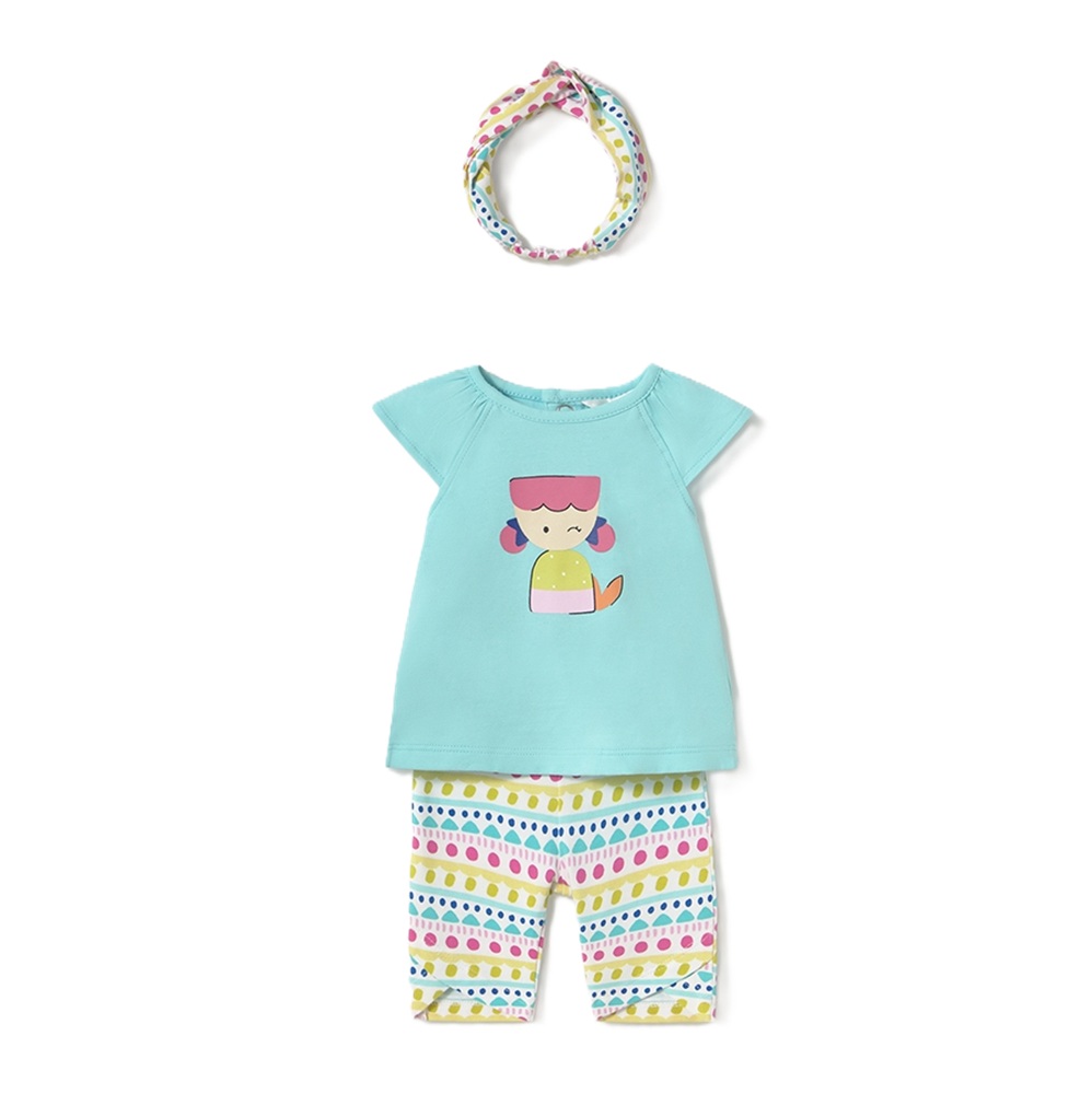 Completo 3 pezzi composto da: t-shirt manica corta con stampa bimbe/frutti, leggings a fantasia multicolore/tinta unita e fascia per capelli in coordinato