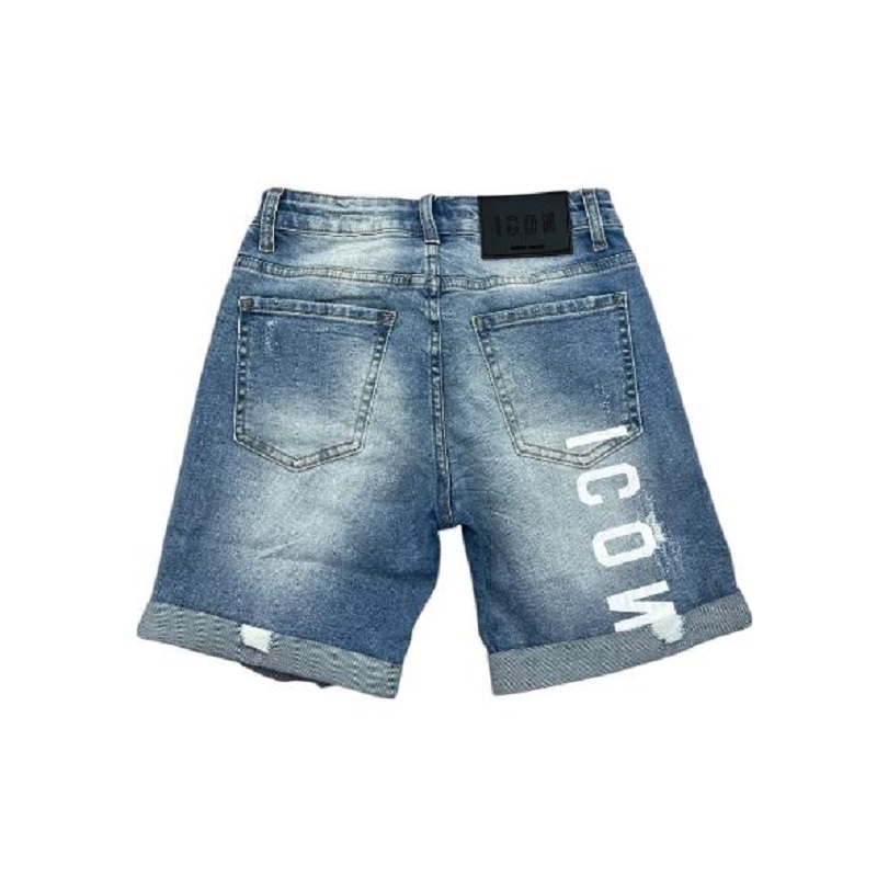 bermuda jeans con cinque tasche con stampa logo a contrasto sul retro, coulisse interna in vita