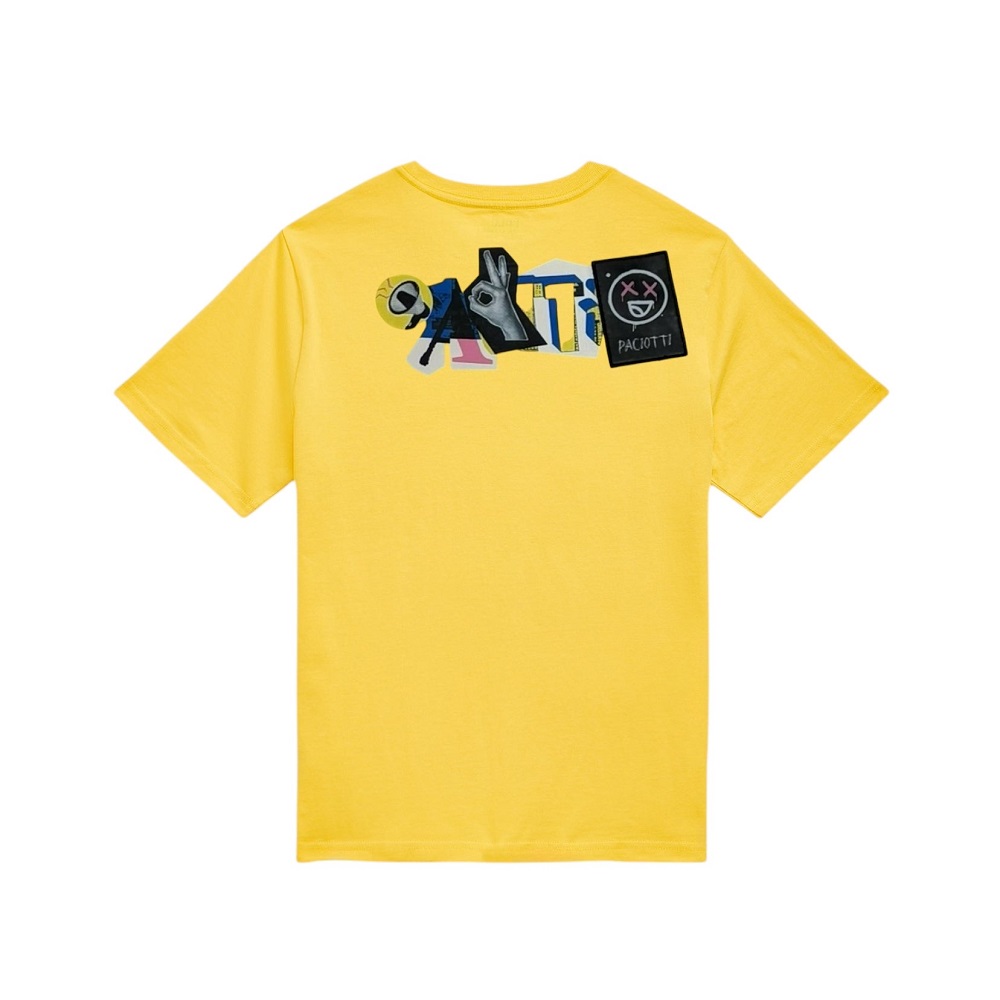 t-shirt a mezza manica in tinta unita con spada a contrasto sul davanti e stampa con targhetta sul retro