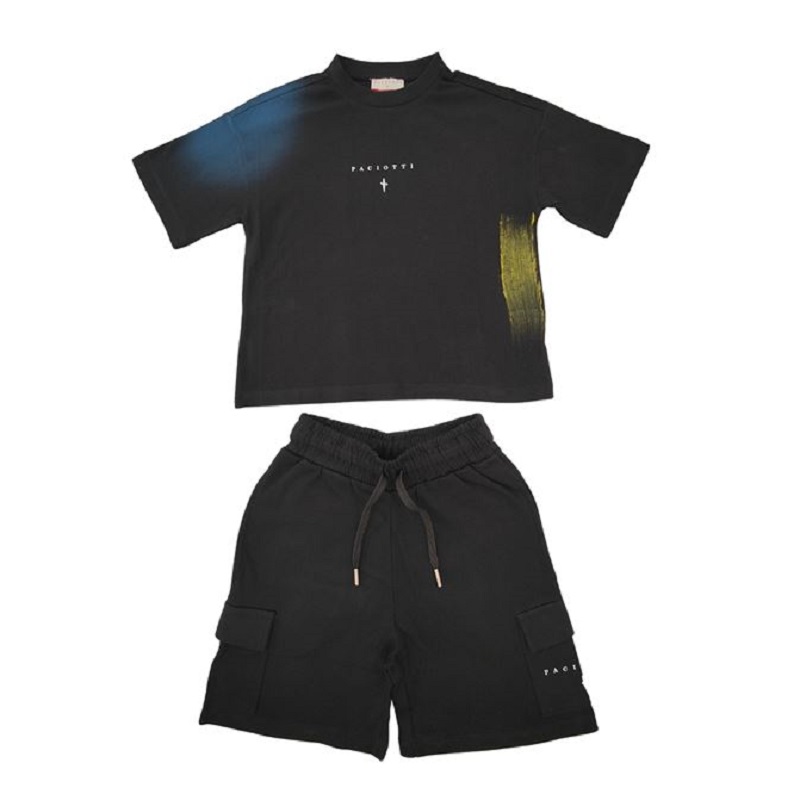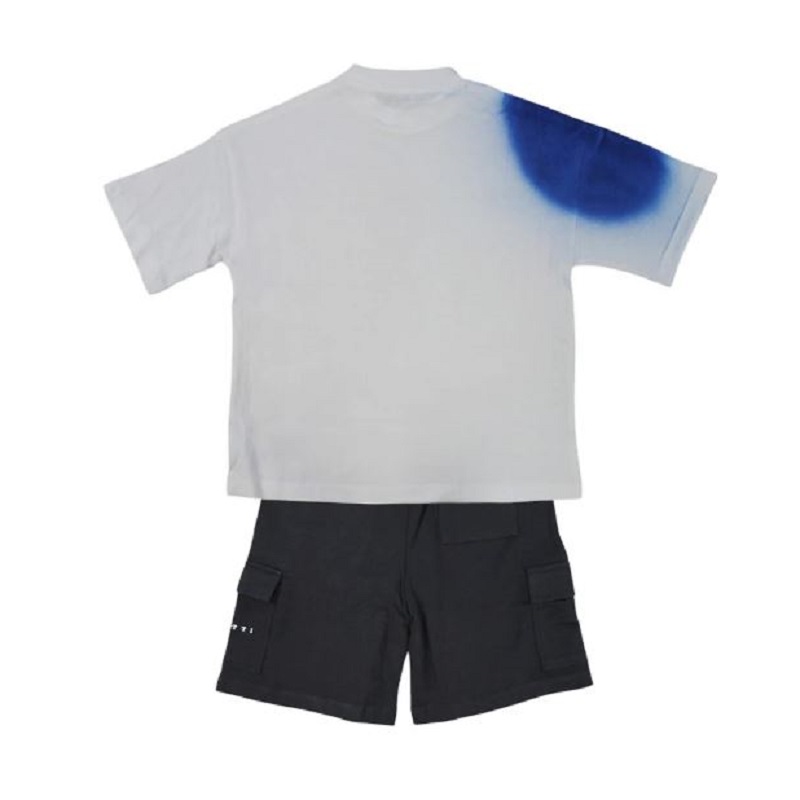completo composto da t-shirt a mezza manica con sfumature di colore, logo sul davanti, bermuda cargo in felpa con elastico e coulisse in vita