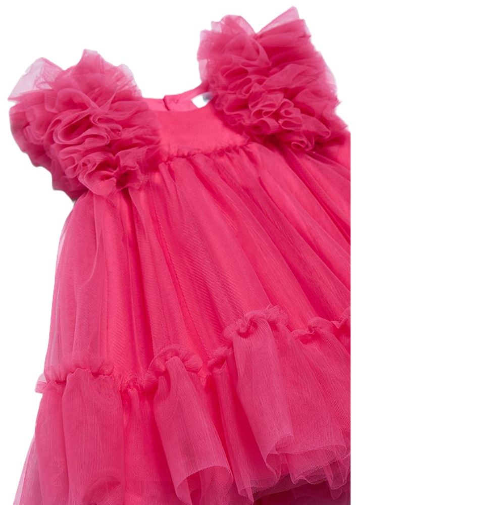 Vestito tinta unita in tulle smanicato con rouges, chiusura posteriore con bottoni