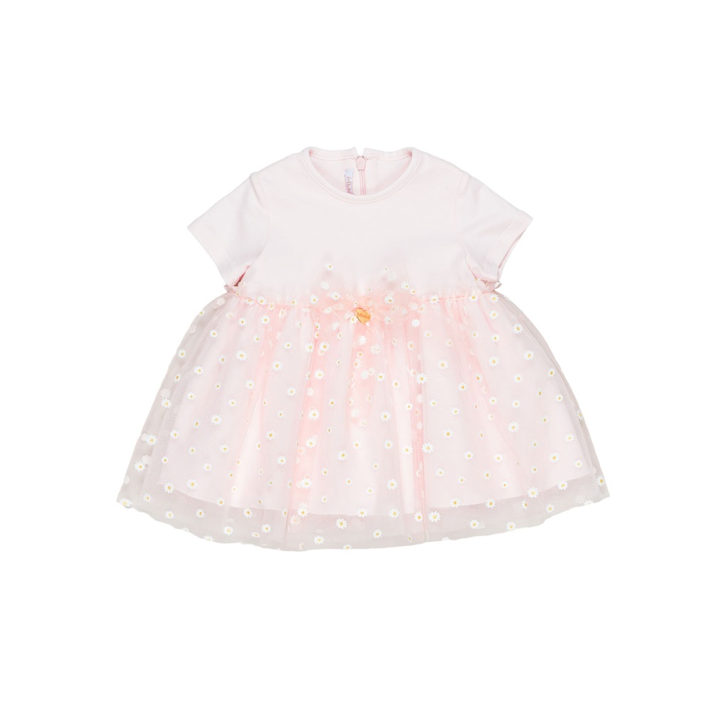 Abito tinta unita a maniche corte, parte inferiore in tulle con margherite, chiusura posteriore con zip