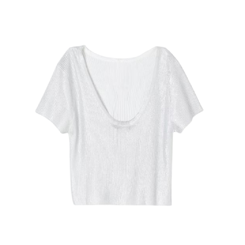 t-shirt in maglia a coste laminata con mezza manica e scollatura sul retro