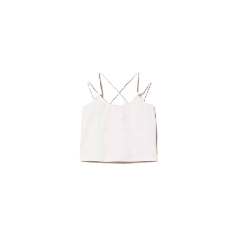 top in cotone tinta unita con spalline incrociate sul retro e ricamo oval T sul davanti tono su tono