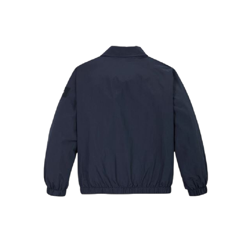 giubbino antivento modello bomber con colletto , chiusura bottoni clips, dettaglio ricamo marchio a contrasto colore e tasche a filo su fondo