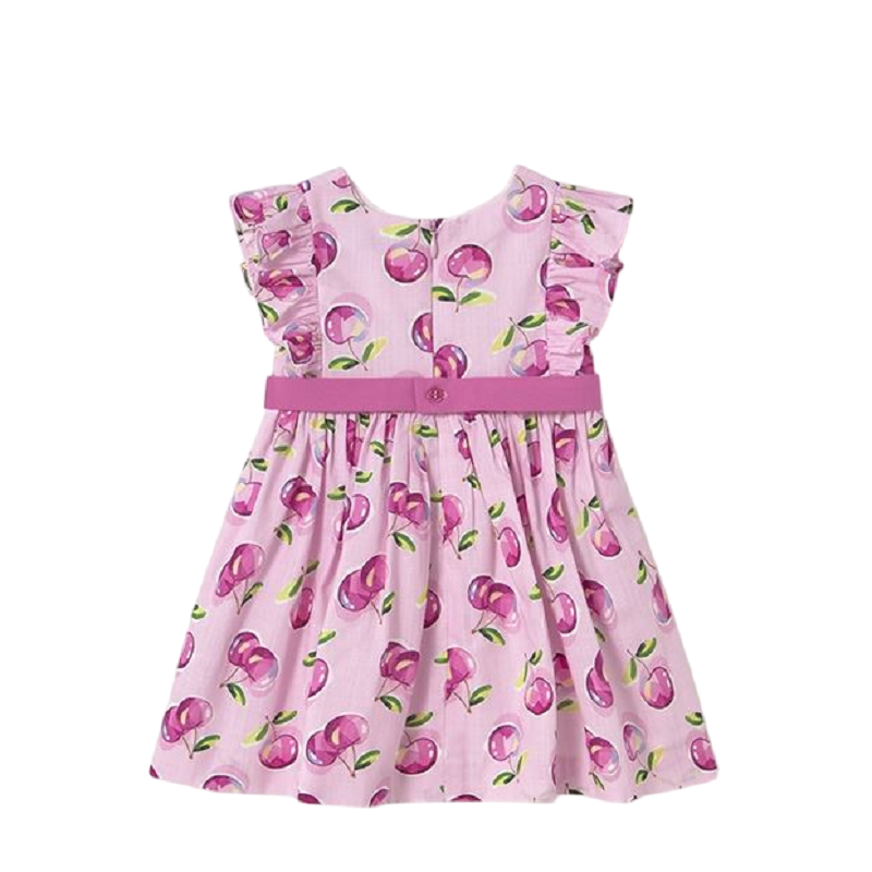 vestito a fantasia ciliegie con volant su giromanica e fascia fiocco in vita