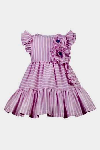 Abito a righe, manica con volant e applicazione fiori anteriori, chiusura posteriore con zip