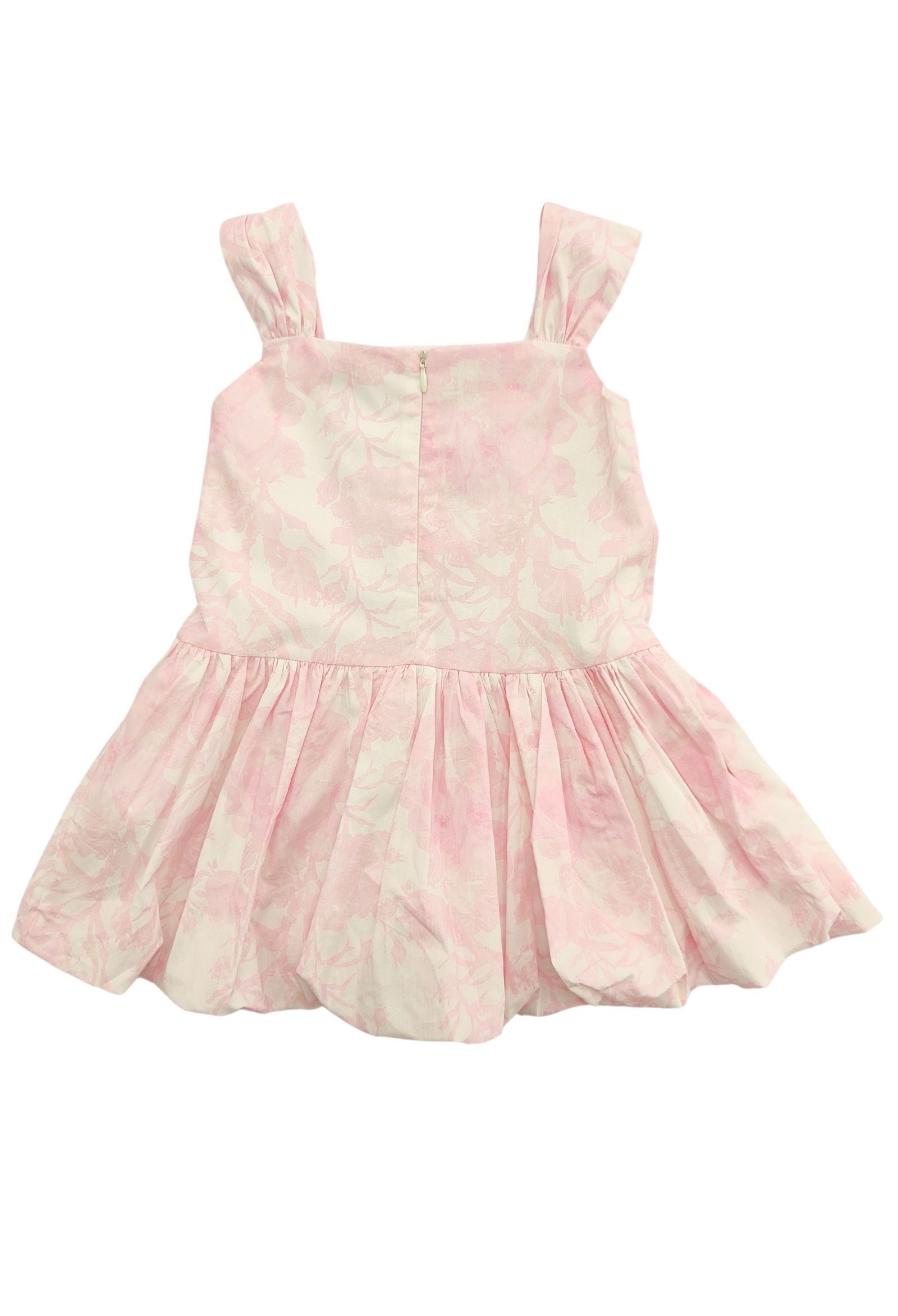 Abito con bretelle, stampa fiori a contrasto e fondo a palloncino