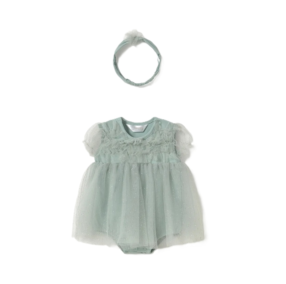 Vestito manca corta in tulle tinta unita a taglio dritto e dettaglio glitter all over, fascia per capelli in coordinato