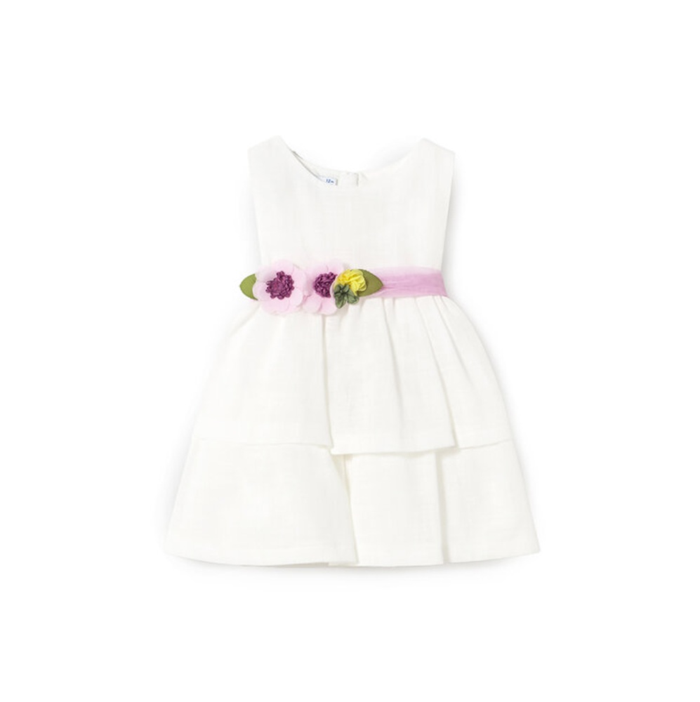 Abito a balze tinta unita con cintura in vita a contrasto e applicazione fiori