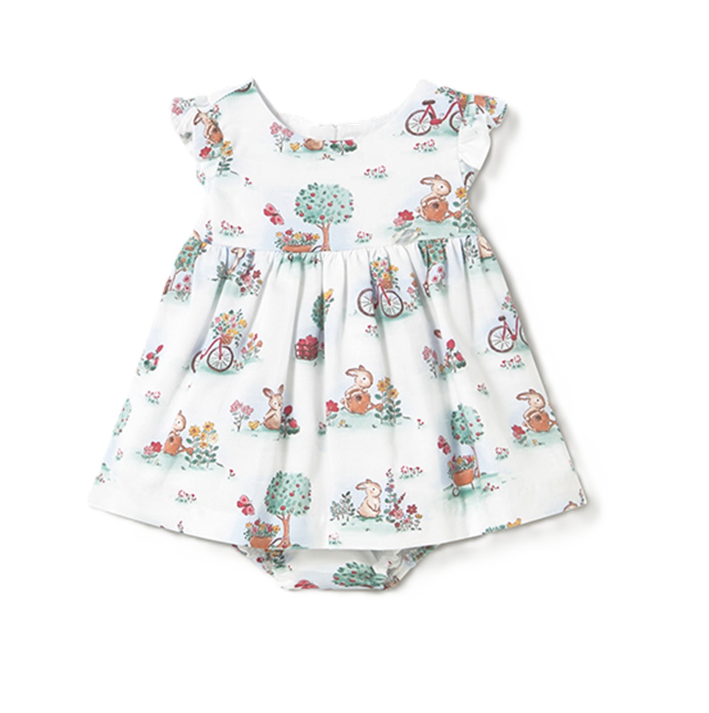 vestito svasato a fantasia coniglietti con volant su giromanica e coulotte abbinata