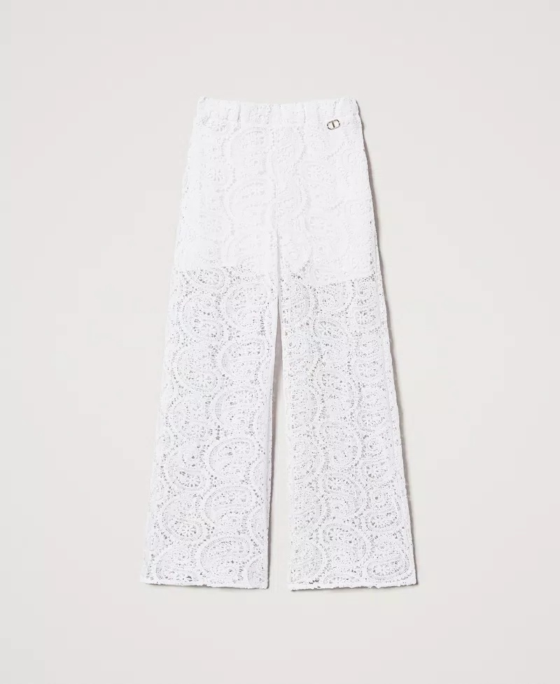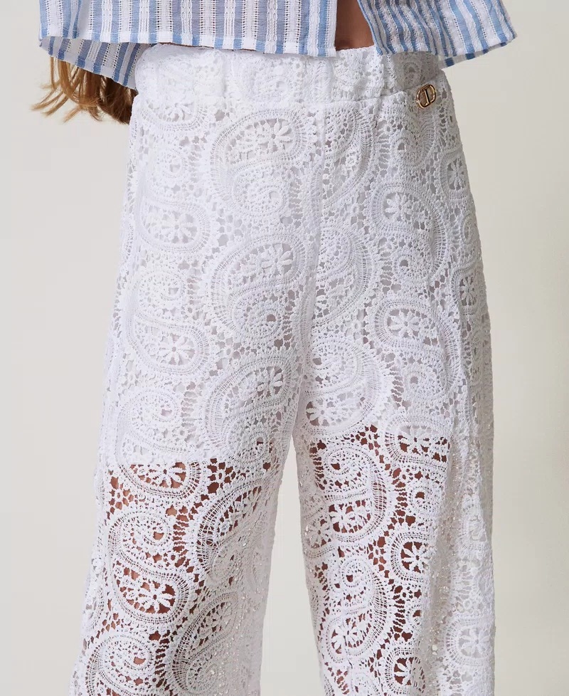 Pantaloni tinta unita in pizzo macramè a fantasia cashmere con elastico in vita, placchetta logo Oval T, shorts fodera in mussola di cotone e linea dritta