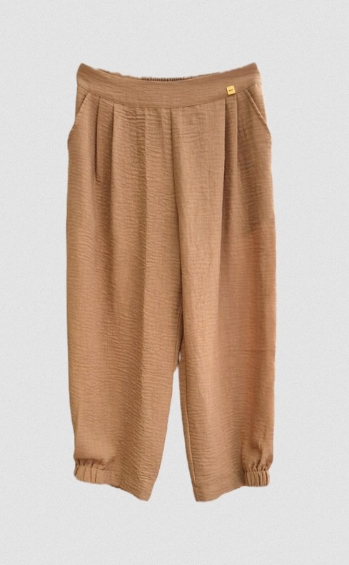 Pantaloni tinta unita vestibilità balloon con pinces, retro vita e fondo con elastico, chiusura con zip laterale e tasche sui fianchi.