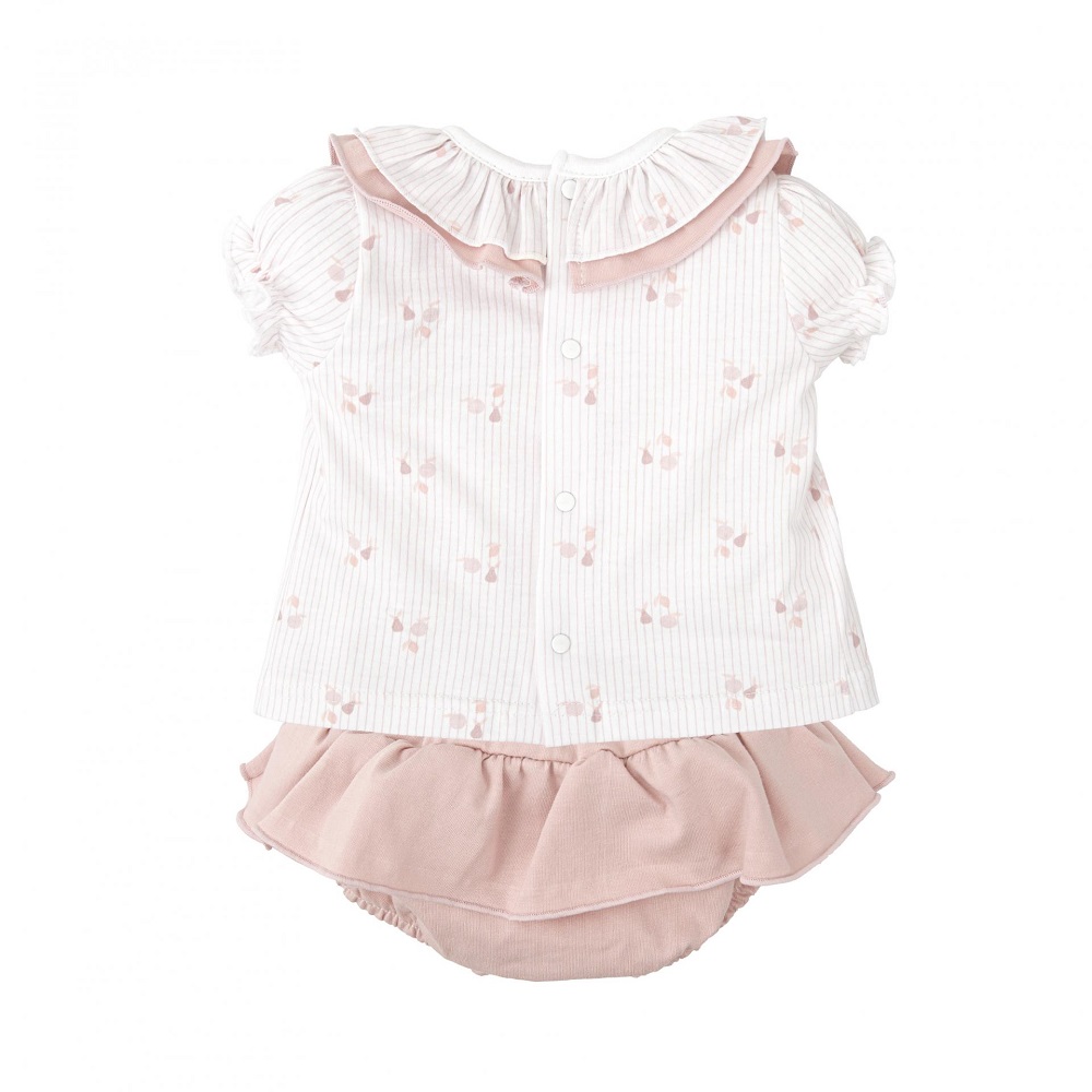 completo composto da blusa a righe svasata con mezza manica a palloncino, colletto volant e coulotte in tinta unita coordinata