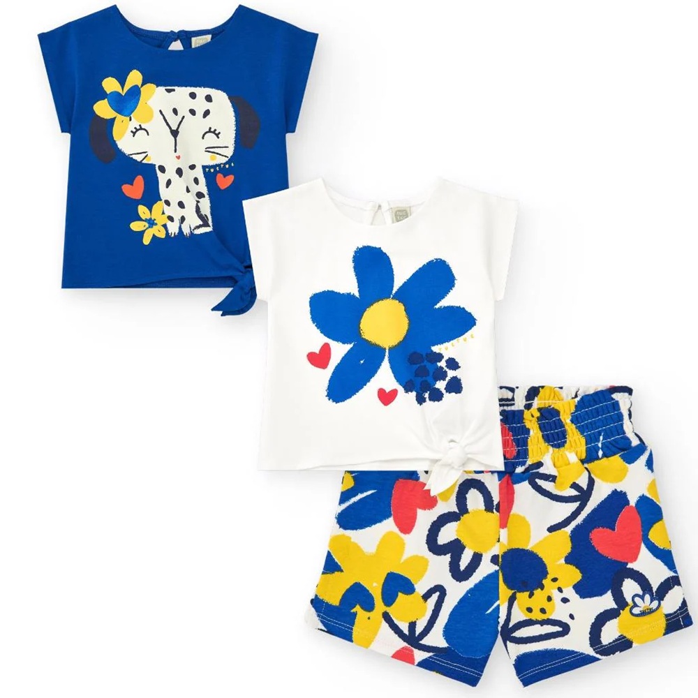 Completo 3 pezzi composto da: 2 t-shirt manica corta con stampa anteriore a contrasto e nodo, pantaloncini fantasia multicolore