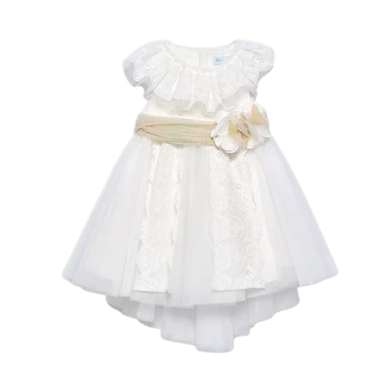 abito cerimonia in tulle pois con volant lungo lo scollo, dettagli fasce in pizzo e fascia in vita glitter con fiori