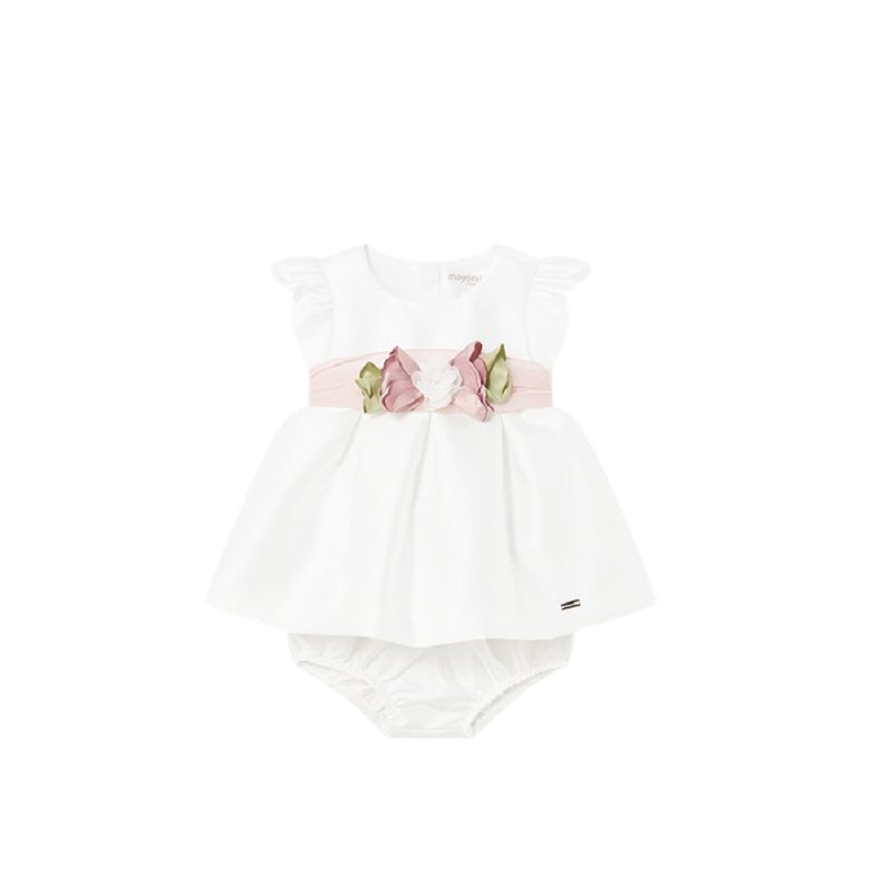 Abito in mikado tinta unita con fascia in vita a contrasto e applicazione fiori + coulotte