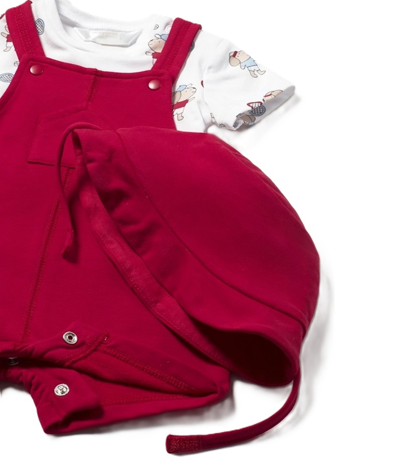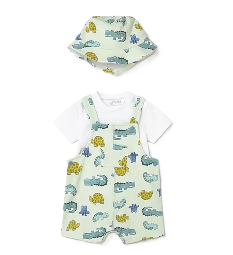 completo composto da t-shirt manica corta basic/stampa all over, salopette e cappello con stampa animali all over/tinta unita a contrasto