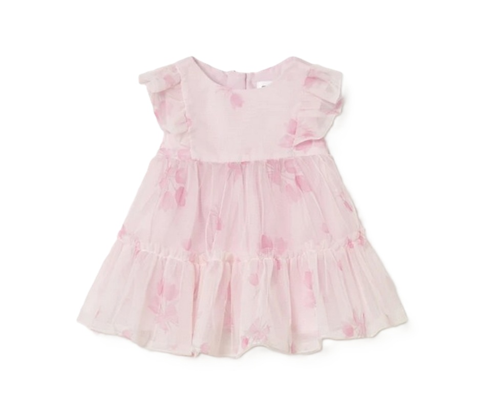 Vestito in tulle con maniche volant e stampa fiori/ricamo cuori