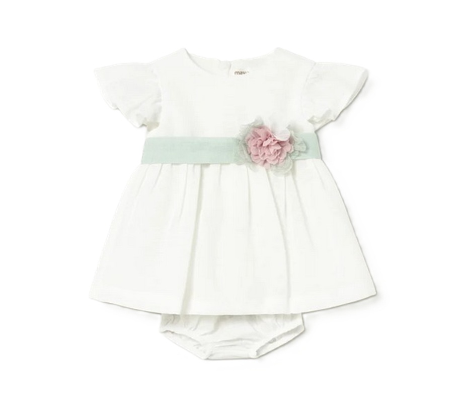 Vestito maniche volant tinta unita con fascia in vita a contrasto e applicazione fiore, coulotte in coordinato